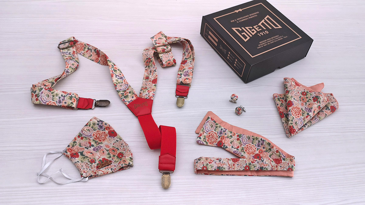 • Le bretelle artigianali (in stoffa nella parte davanti ed elastiche dietro) riscuotono sempre un grande successo, considerate anch’esse un accessorio maschile intramontabile. Gli inserti in pelle color rosso le rendono più eccentriche e fuori dagli schemi.