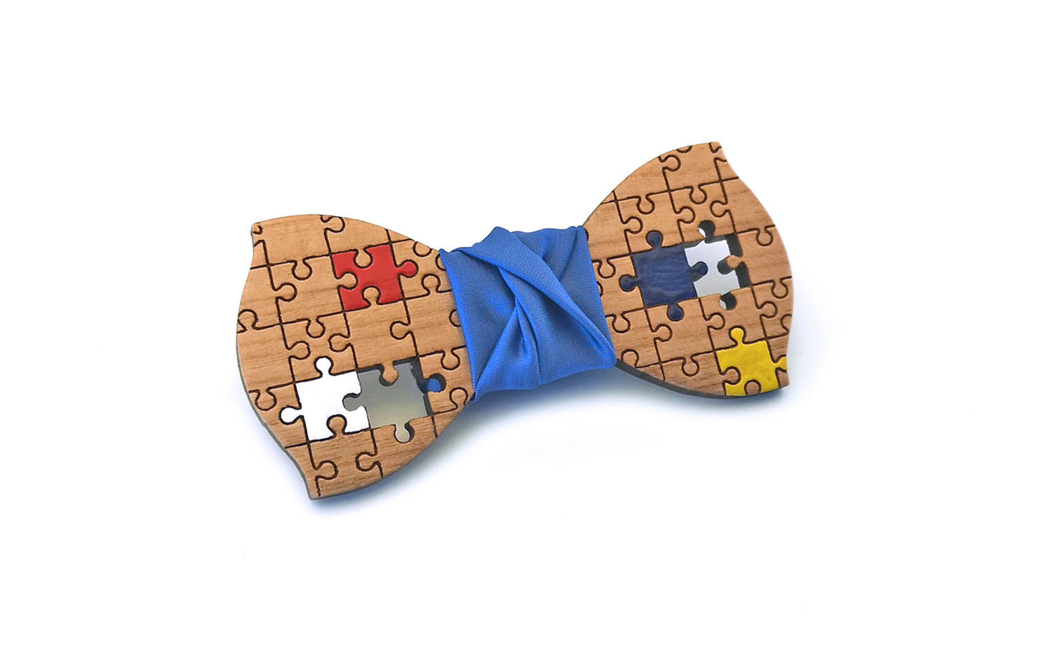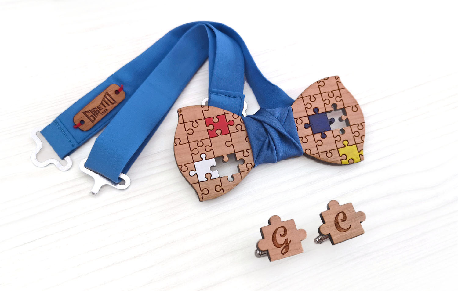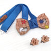 Papillon in legno di ciliegio, puzzle, gemelli con iniziali, fazzoletto da taschino